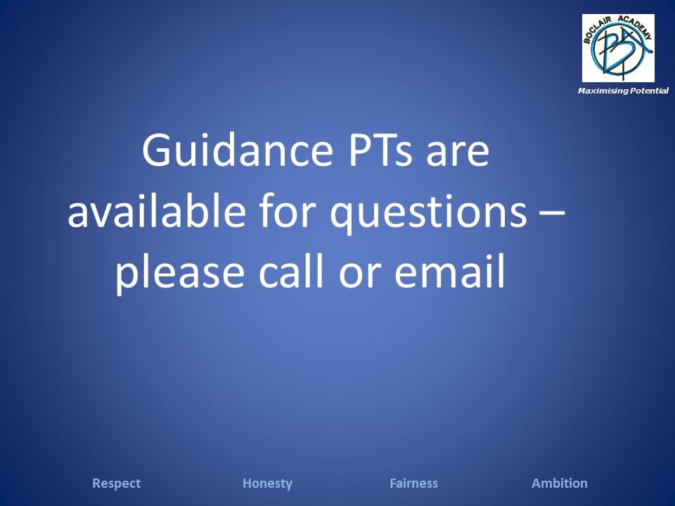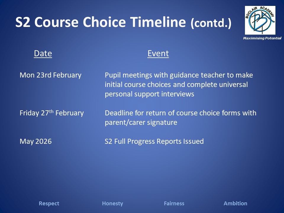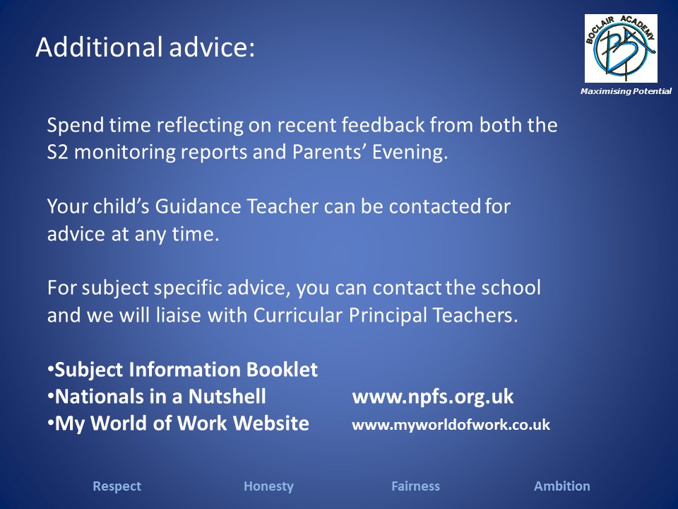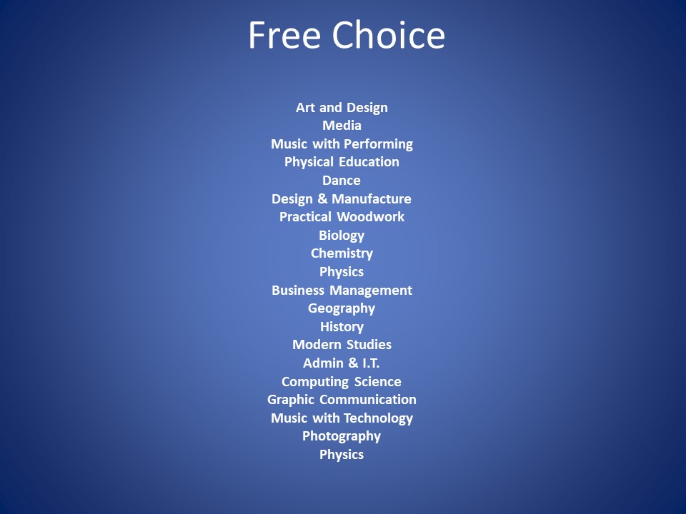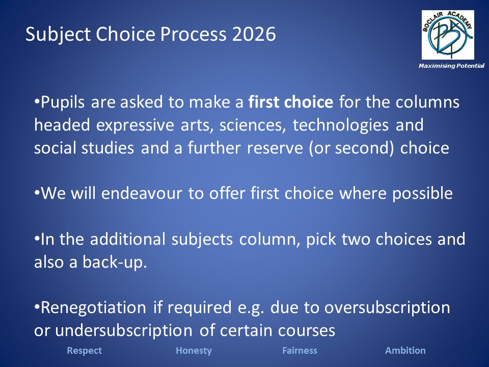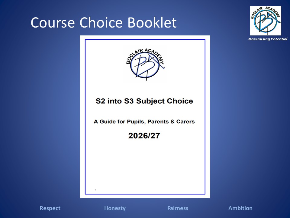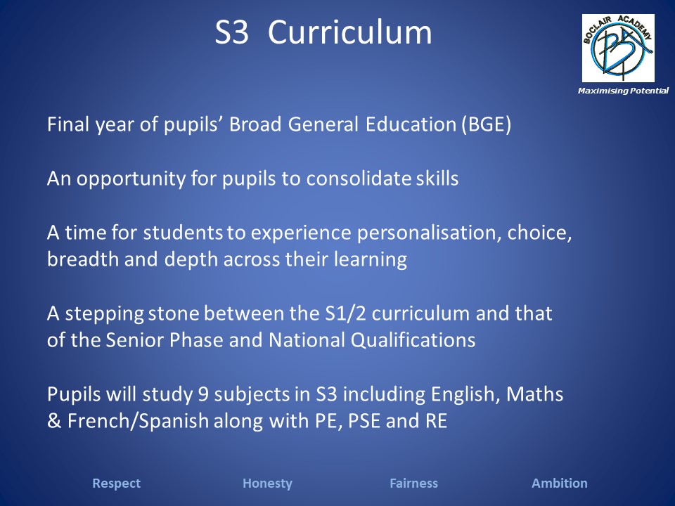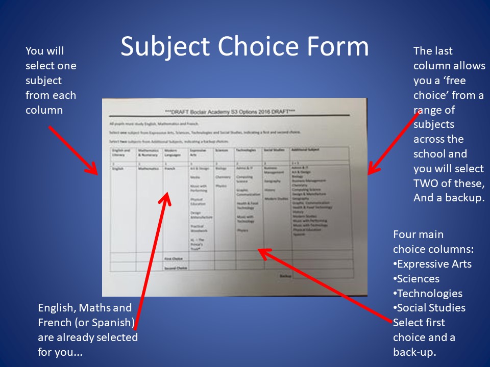 The S2 Broad General Education Option Choices Booklet describes the options available to pupils for study in S3. Entry requirements for each subject are also listed. Pupils who are unsure of which subjects to take can discuss their choices with their subject teachers, Guidance teachers or year head.