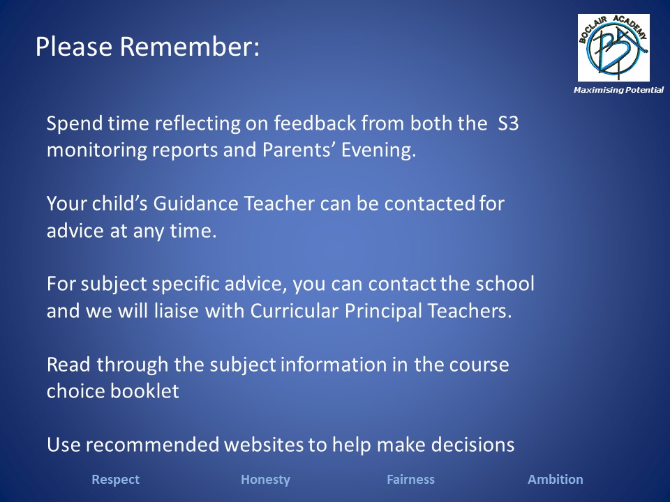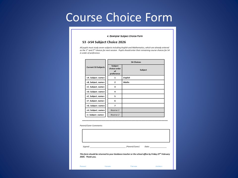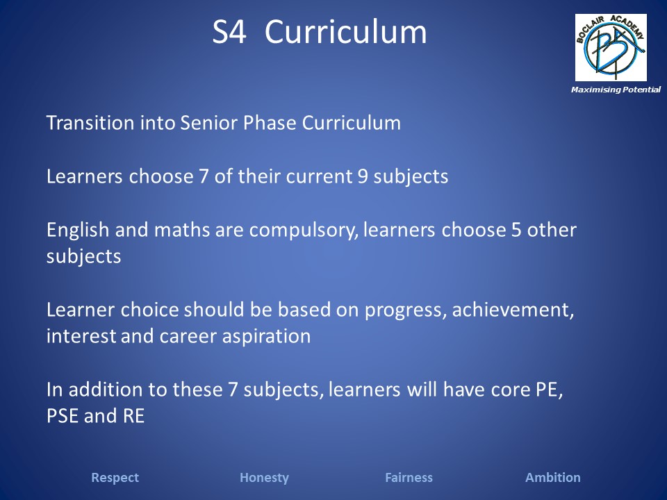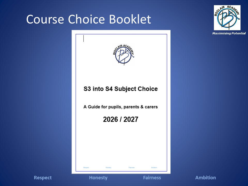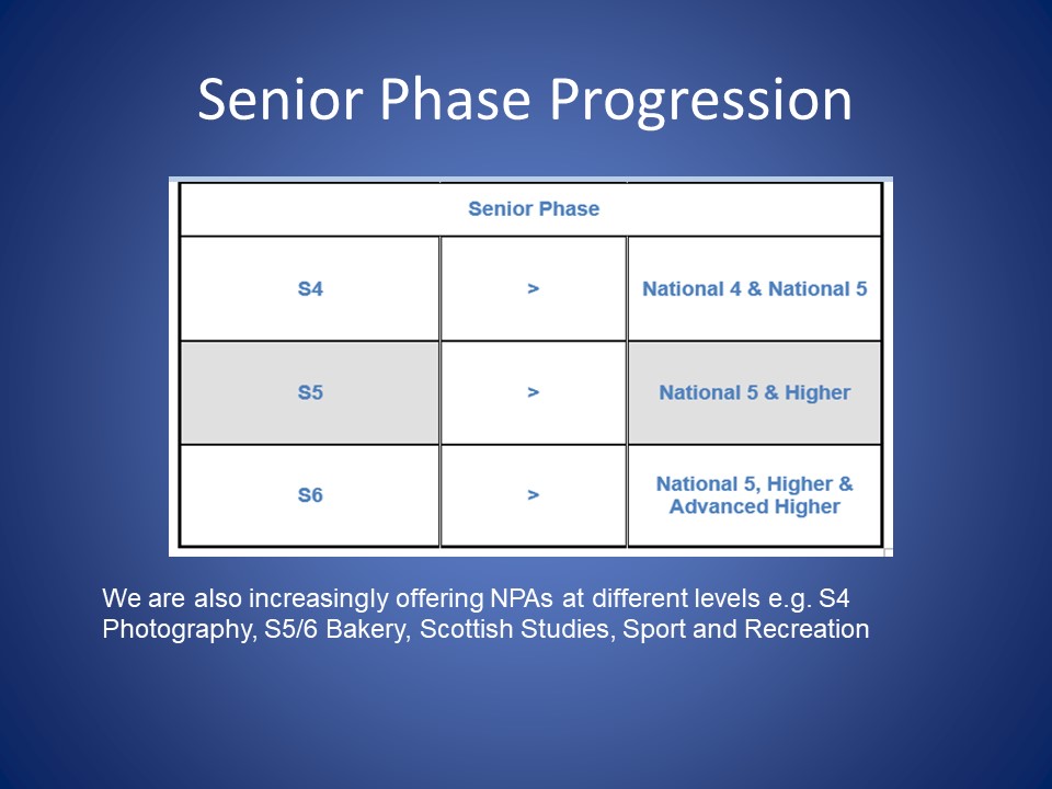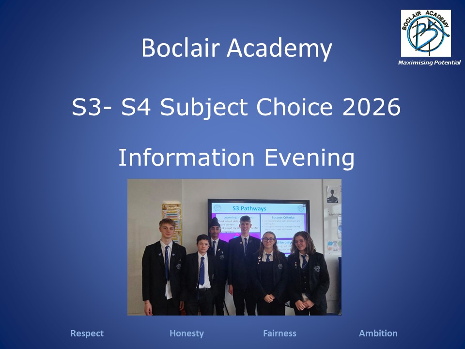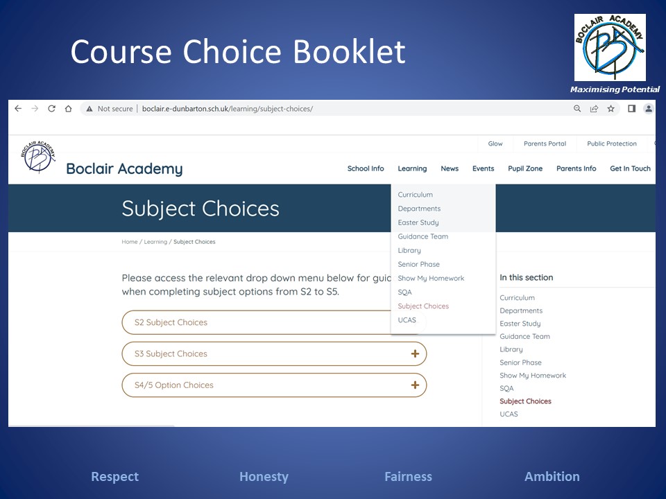 In S3 pupils must make choices about which of their S3 subjects they will continue with in S4. In S4 pupils generally undertake 7 subjects at National 4 and/or National 5. A copy of the BGE (S3) in to Senior Phase (S4) Options booklet is available by clicking on the link below. Pupils can discuss their choices with their Guidance teacher or year head.