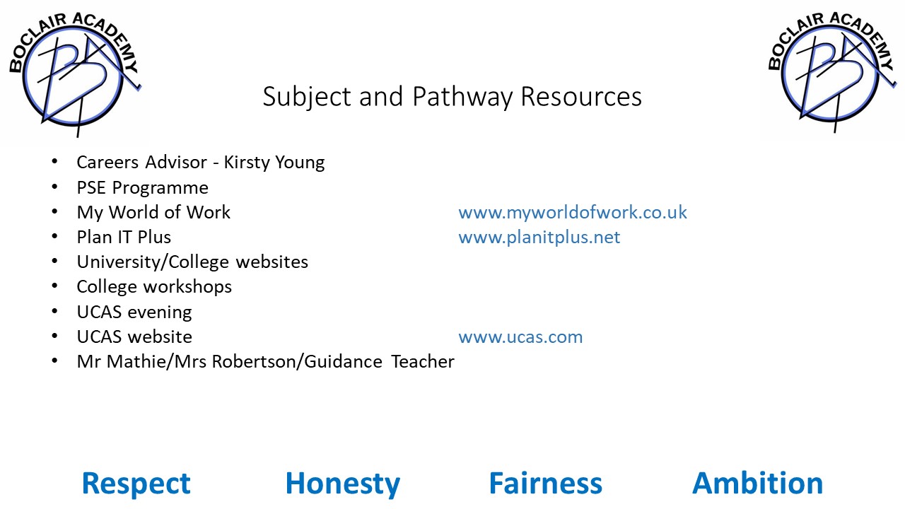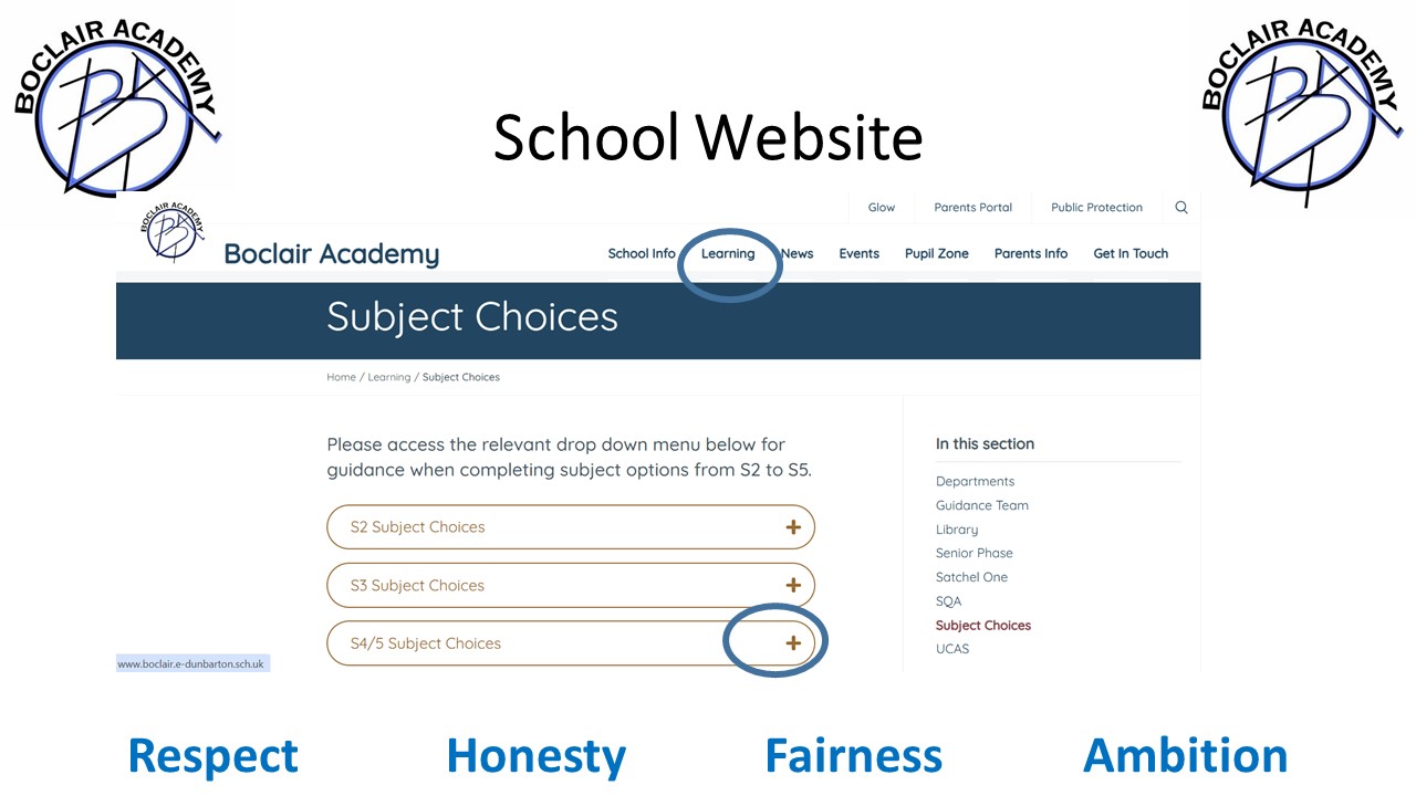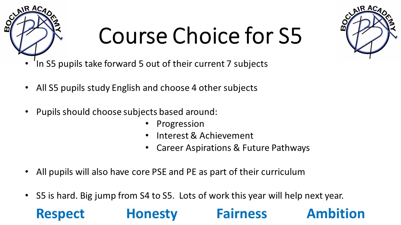 Pupils in S4 begin planning for S5 in Term 2. Pupils who are unsure of which subjects to take can discuss their choices with their subject teachers, Guidance teachers or year head.