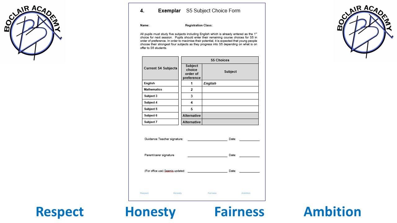 S4 into S5 Mock Form - this form is for demonstration only. Each pupil will be issued with a personalised form to complete with their choices.