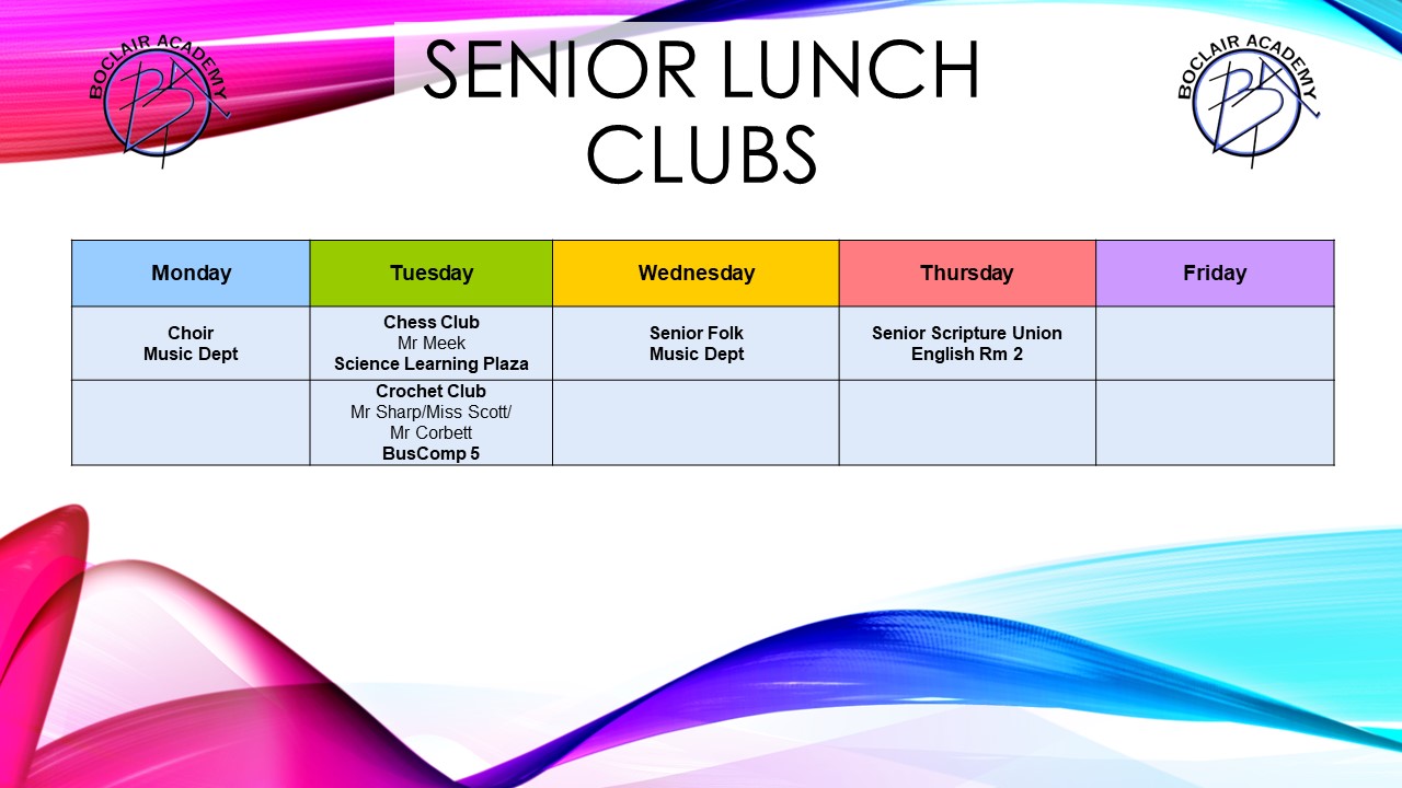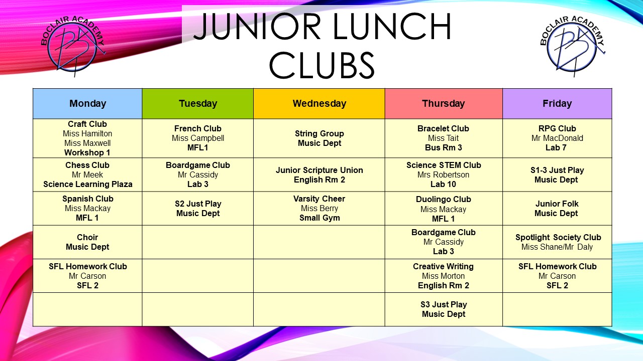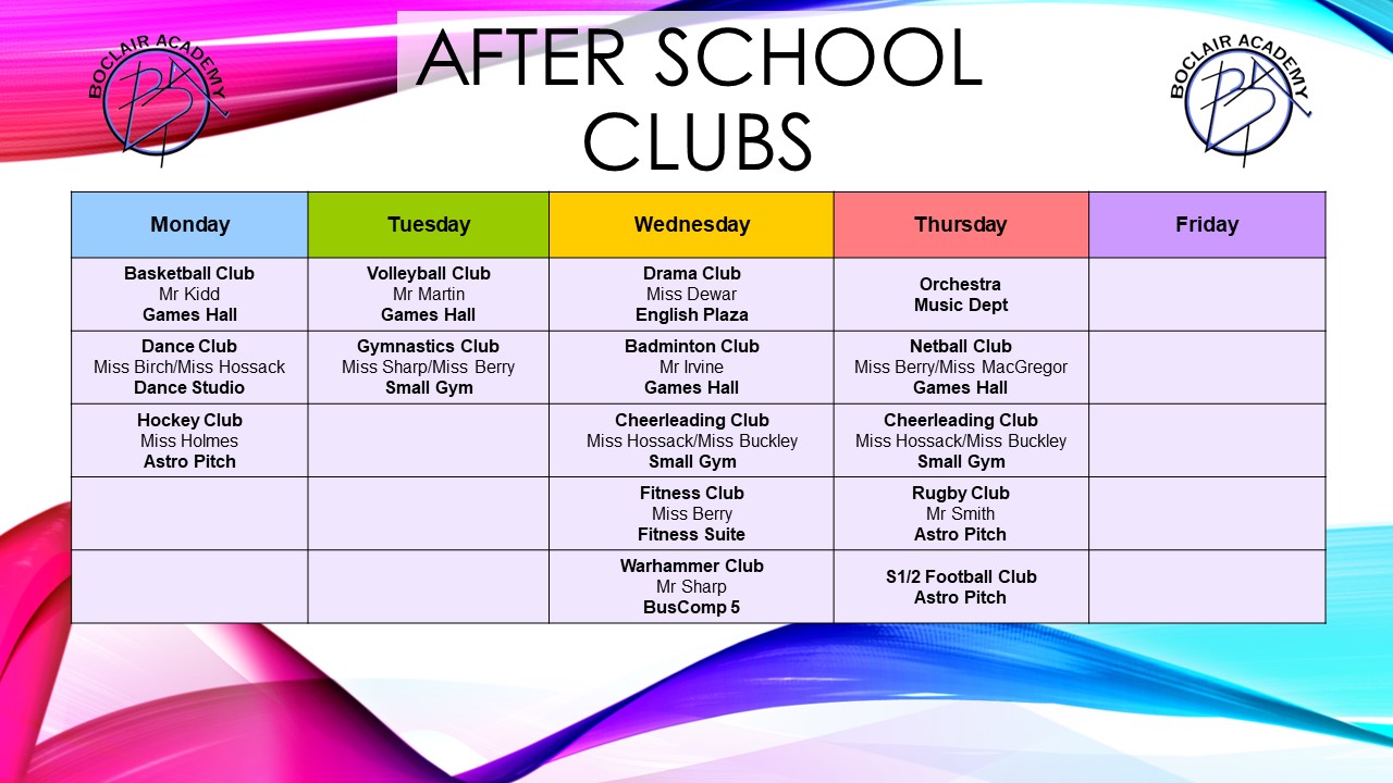Boclair Academy offers a wide range of extra-curricular clubs within the school, both at lunchtime and at the end of the school day. Details of these can be found below: